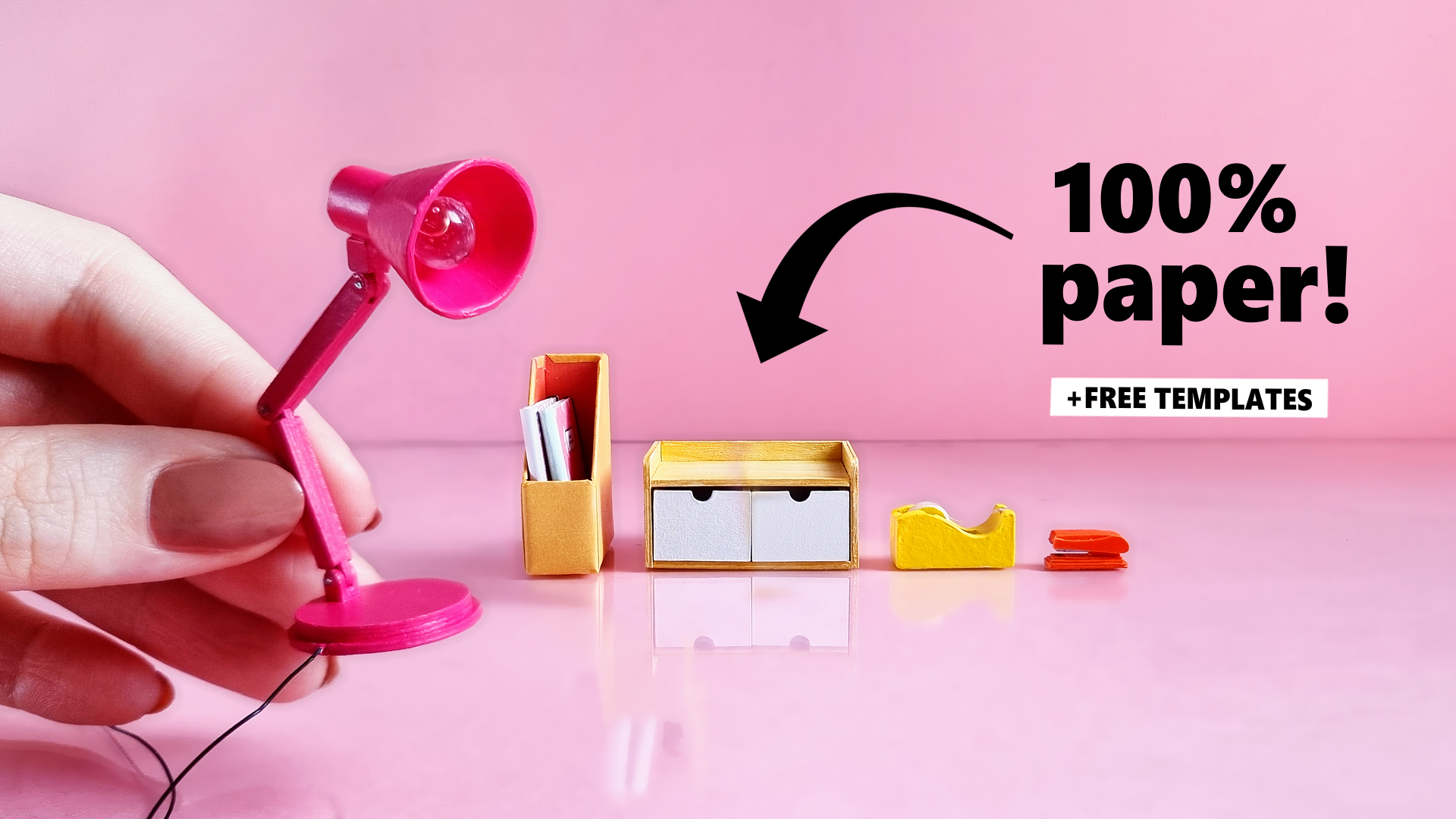 Learn how to make a set of miniature desk clutter, including a "movable" desk lamp, tape holder, stapler, desk organiser and more! A free printable template is provided; you'll find the download link in the video.